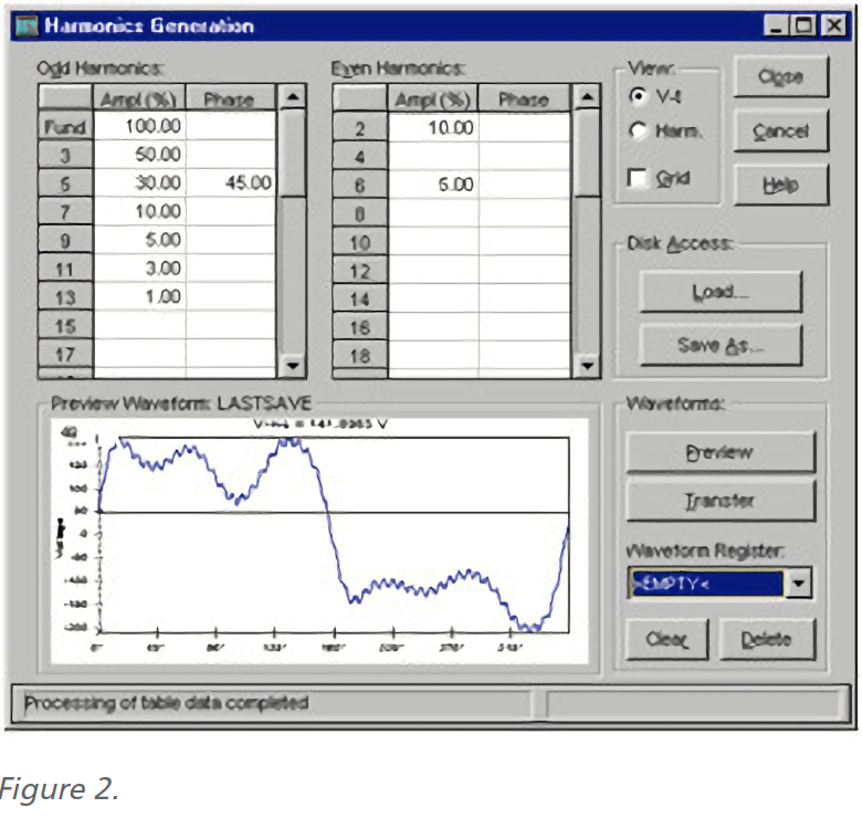 AMETEK offers many different interfaces, including RS-232, USB, GPIB, and Ethernet, for integrating an AC source with your test system. In addition to the hardware, AMETEK also supplies IVI drivers with each AC source for use with National Instruments LabVIEW and LabWindows/CVI. Other user-developed systems are readily supported due to the use of SCPI programming syntax. This eases the tasks of ATE system programming and integration. In addition, a Graphical User Interface application is supplied to provide a means of remote operation. Figure 2 shows how you use this application to easily create a test waveform with harmonic content.